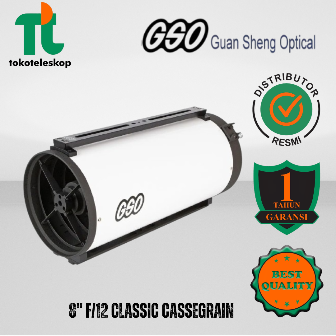 Teleskop Cassegrain 200 mm (8 inci) f/12 dari GSO ini merupakan versi modern dari desain Cassegrain klasik. Dengan panjang fokus 2400 mm, teleskop ini sangat cocok untuk pengamatan visual dan pencitraan astronomi yang tajam serta memiliki ketajaman detail yang tinggi