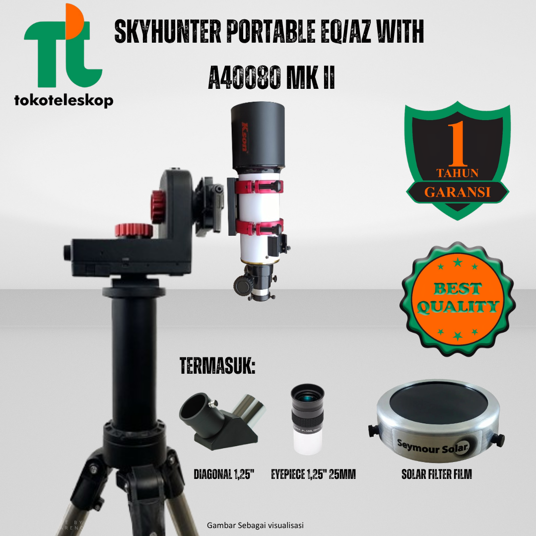 Paket teropong hilal ini cocok untuk kebutuhan observasi bulan sabit (rukyatul hilal), sekaligus ideal untuk pengamatan objek langit dan objek terestrial. Kombinasi mount portabel iOptron Sky Hunter dengan teleskop Kson A40080 MK II memberikan stabilitas, presisi, dan kualitas yang optimal dalam satu paket praktis.